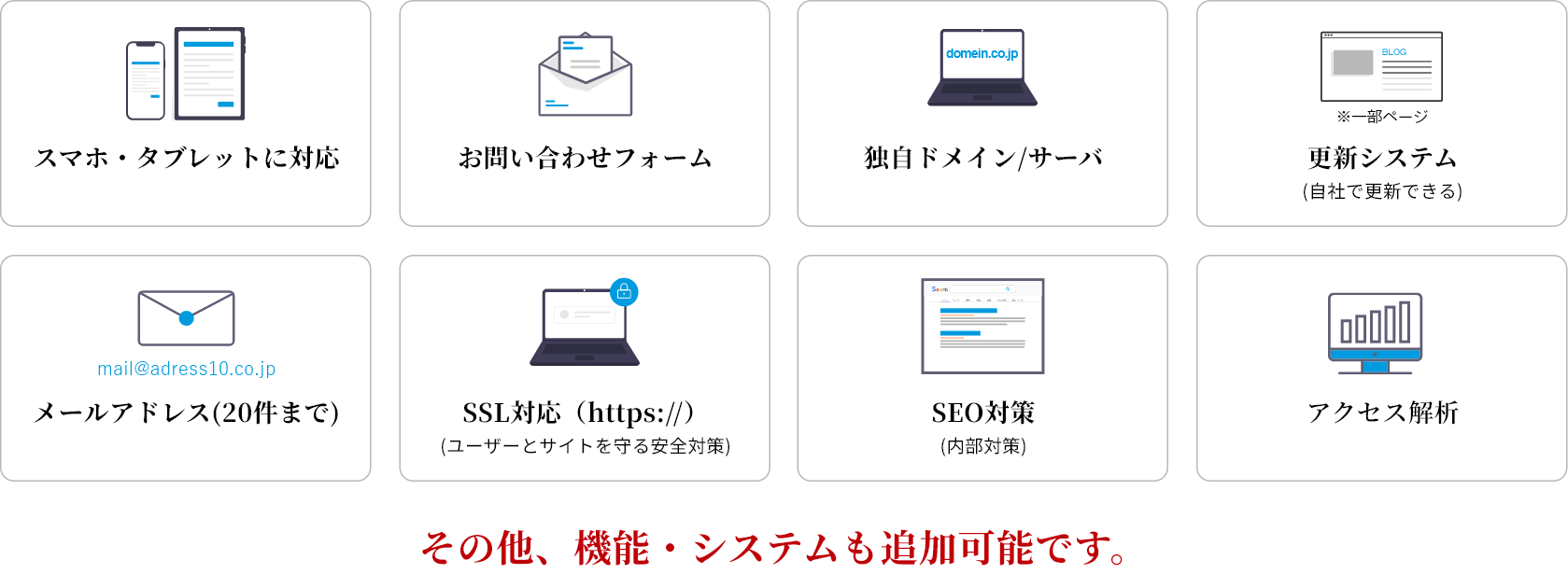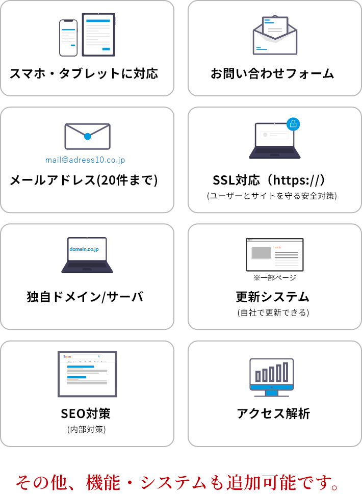 • 少ない負担で制作/サイト構成をご提案/原稿作成サポート付き/院内・スタッフの写真撮影代行※※別途費用がかかる場合がございます。少ない負担で制作/サイト構成をご提案/原稿作成サポート付き/院内・スタッフの写真撮影代行※※別途費用がかかる場合がございます。